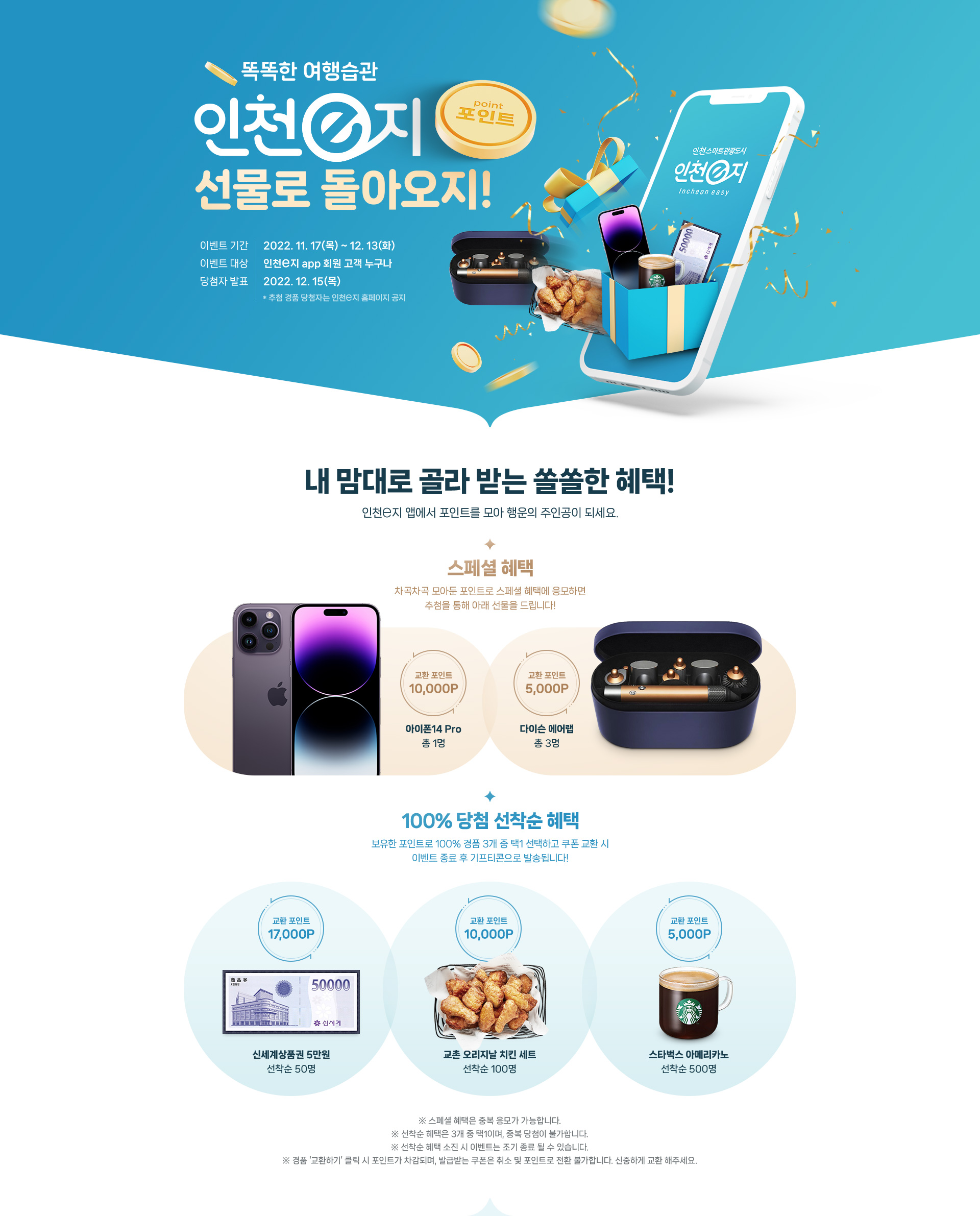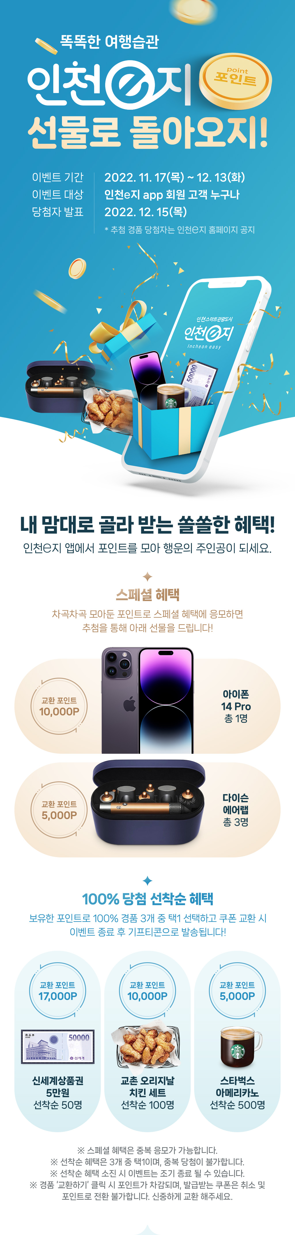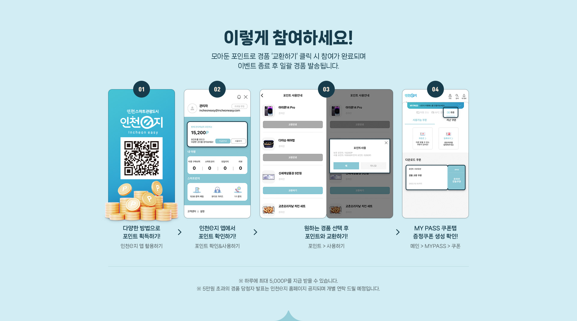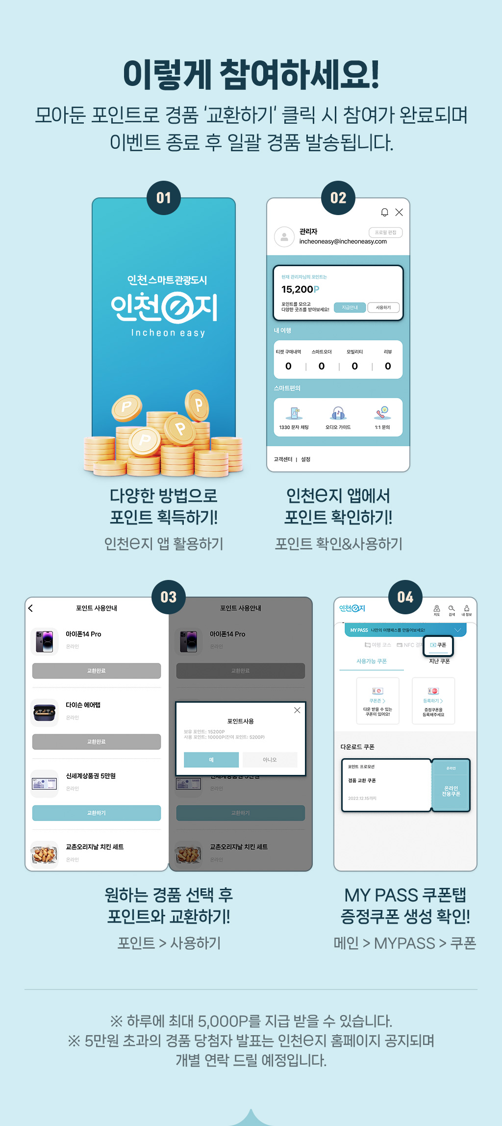 본 이벤트는 기간 내 인천e지 앱 내 포인트로 경품 ‘교환하기’ 클릭 시 자동 참여됩니다.